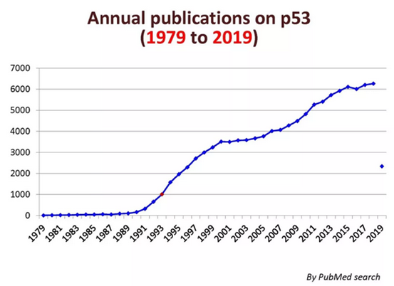 在人类基因组所包含的数万条基因中,它是研究的最为透切的一个。p53已成为抗肿瘤基因治疗药物研发中的热门靶点。在美国国立生物医学信息中心的生物医学文献数据库(pubmed)中,有关它的研究文献每年都在稳定的增长。