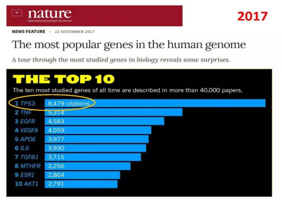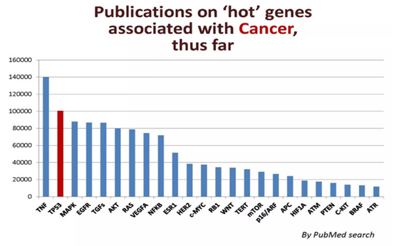 Nature News推出的“The most popular genes in the human genome”中,列出了一系列人类基因研究中“最火爆”的基因清单,肿瘤抑制基因TP53称得上当之无愧的明星基因。作为榜单之首的TP53基因,是最早发现的肿瘤抑制基因之一,在遏制肿瘤细胞生长、DNA修复、以及细胞程序化死亡等方面发挥着十分重要的作用,被称为“基因组的守护者”,人类超过50%的恶性肿瘤包括常见的肝癌、乳腺癌、膀胱癌、胃癌、结肠癌、前列腺癌、软组织肉瘤、卵巢癌、脑瘤、淋巴细胞肿瘤、食道癌、肺癌、成骨肉瘤等,都与P53基因的突变有关。